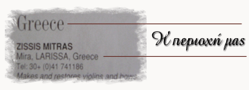 Το χωριό μας τα "Μύρα" είναι ένα όμορφο μικρό χωριό στους πρόποδες του βουνού. Διαθέτει ένα ήπιο κλίμα, και οι κάτοικοι ασχολούντε με την αγροτική καλλιέργεια όσο και με την κτηνοτροφία. Σε αυτο το μικρό χωριό υπάρχει το εργαστήριο μας όπου κατασκευάζουμε τα μοναδικά χειροποίητα βιολιά.